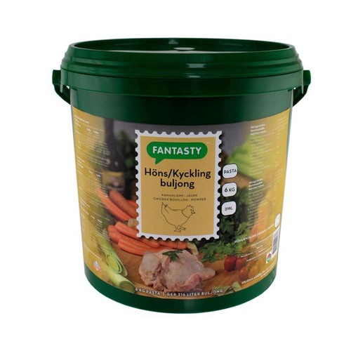 Art.nr: 18177Buljong Höns/Kyckling Pasta 6kg/st för restaurang, gatukök, take-away och storkök. En kraftfull och smakrik kycklingbuljong i pastaform, speciellt framtagen för restauranger, storkök och cateringverksamhet. Den koncentrerade pastan ger en fyllig, välbalanserad kycklingsmak med tydliga toner av långkokt höns, grönsaker och kryddor.
