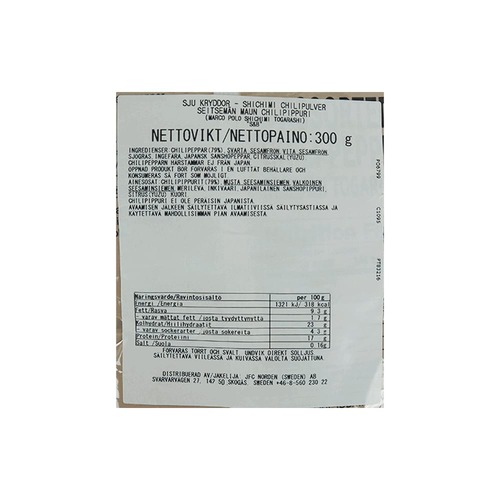 Art.nr: 19779Shichimi Togarashi (Japansk kryddblandning) 300g för restaurang, gatukök, take-away och storkök. Shichimi Nanami Togarashi är en japansk kryddblandning på sju stycken olika kryddor. Shichimi Nanami Togarashi adderar lite hetta i smaken och strös över innan servering av rätter som soba och udon.